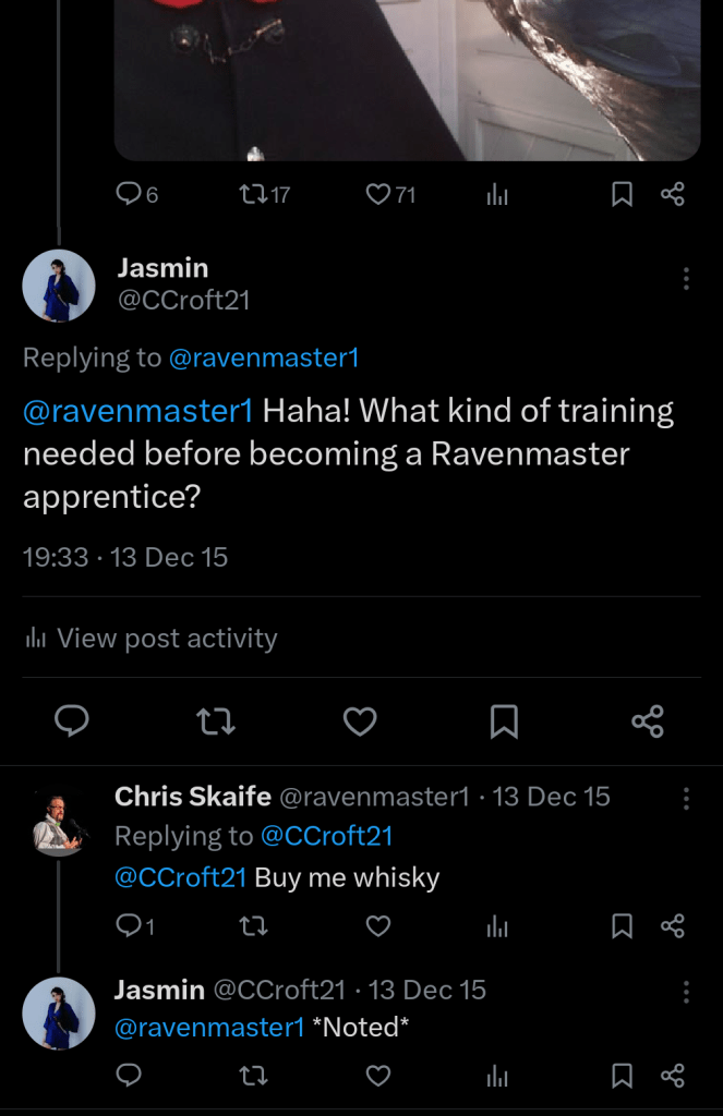 The ravens are cared for by the Ravenmaster, a Yeoman Warder who ensures their well-being and manages their daily activities. One of the favourite Ravenmaster, however since retired is Chris Skaife – Instagram: https://www.instagram.com/ravenology1/?hl=en